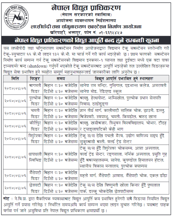प्राधिकरणकाअनुसार प्रथम चरणको सबस्टेसन निर्माण कार्य सम्पन्न गर्न टेकू सबस्टेसनको अहिलेको इनकमर–१ प्यानल तथा दुई वटामध्ये एक वटा पावर ट्रान्सफर्मर बन्द गर्नुपर्ने भएकाले विद्युत आपूर्ति बन्द हुनेछ ।