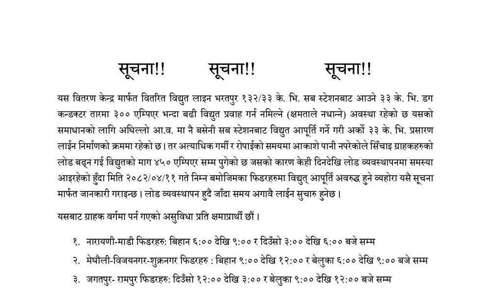 केन्द्रले विद्युत् माग अत्यधिक बढेका कारण नियन्त्रित लोड व्यवस्थापन गर्नुपर्ने अवस्था आएको भन्दै सूचनामार्फत ३९३ घण्टाको गरि कुल ६ घण्टा विद्युत् कटौती हुने जानकारी दिएको छ ।