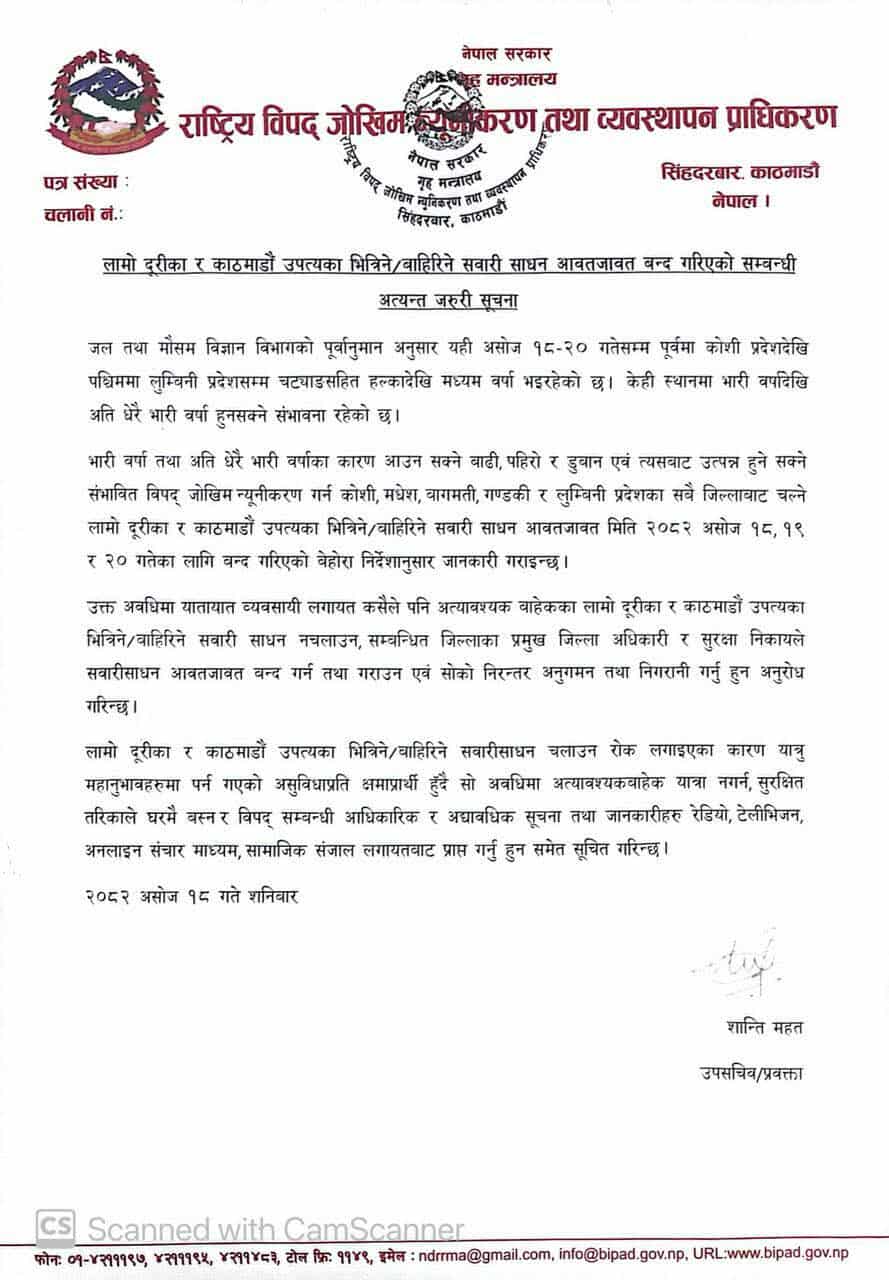 काठमाडौं । राष्ट्रिय विपद् जोखिम न्यूनीकरण तथा व्यवस्थापन प्राधिकरणले लामो दूरीका यातायात तीन दिनका लागि बन्द गर्ने निर्णय गरेको छ ।