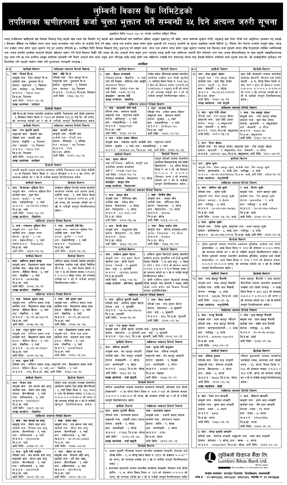 काठमाडौं । लुम्बिनी विकास बैंक लिमिटेडले कर्जा चुक्ता गर्न आउन ३५ दिने सूचना जारी गरेको छ ।