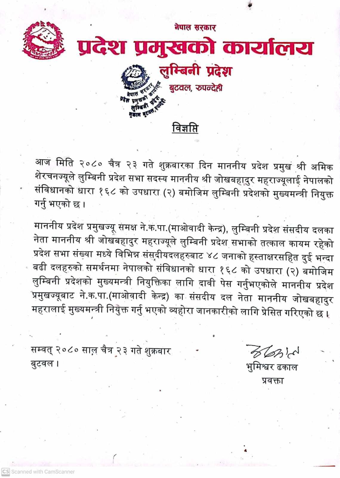 काठमाडौं । लुम्बिनी प्रदेशको मुख्यमन्त्रीमा नेकपा माओवादी केन्द्रका जोखबहादुर महरा नियुक्त भएका छन् ।