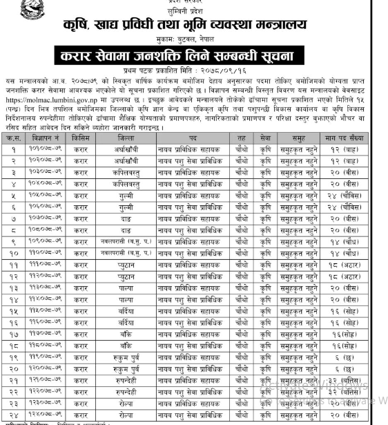 मन्त्रालयले प्रदेशका सबैजसो जिल्लामा नायक प्राविधि सहायक र नायव पशु सेवा प्राविधिकका लागि विज्ञापन आह्वान गरेको हो ।