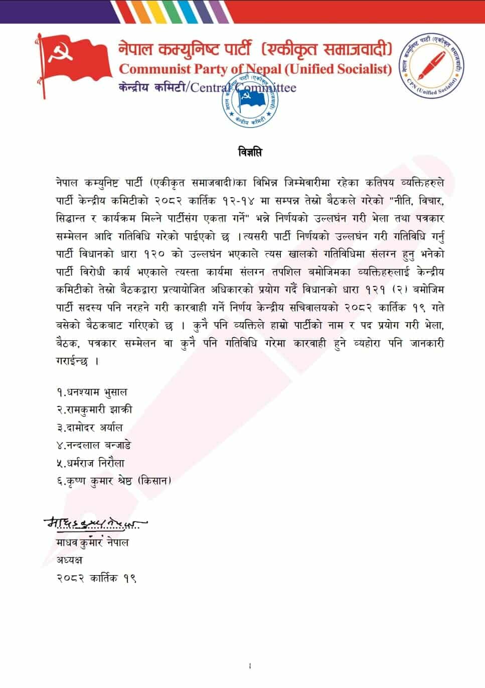काठमाडौं । नेकपा माओवादीसहित १० वाम दलबीच एकता घोषणाकै दिन माधव नेपालले महासचिव घनश्याम भुसालसहित ६ नेतालाई कारबाही गरेका छन् ।