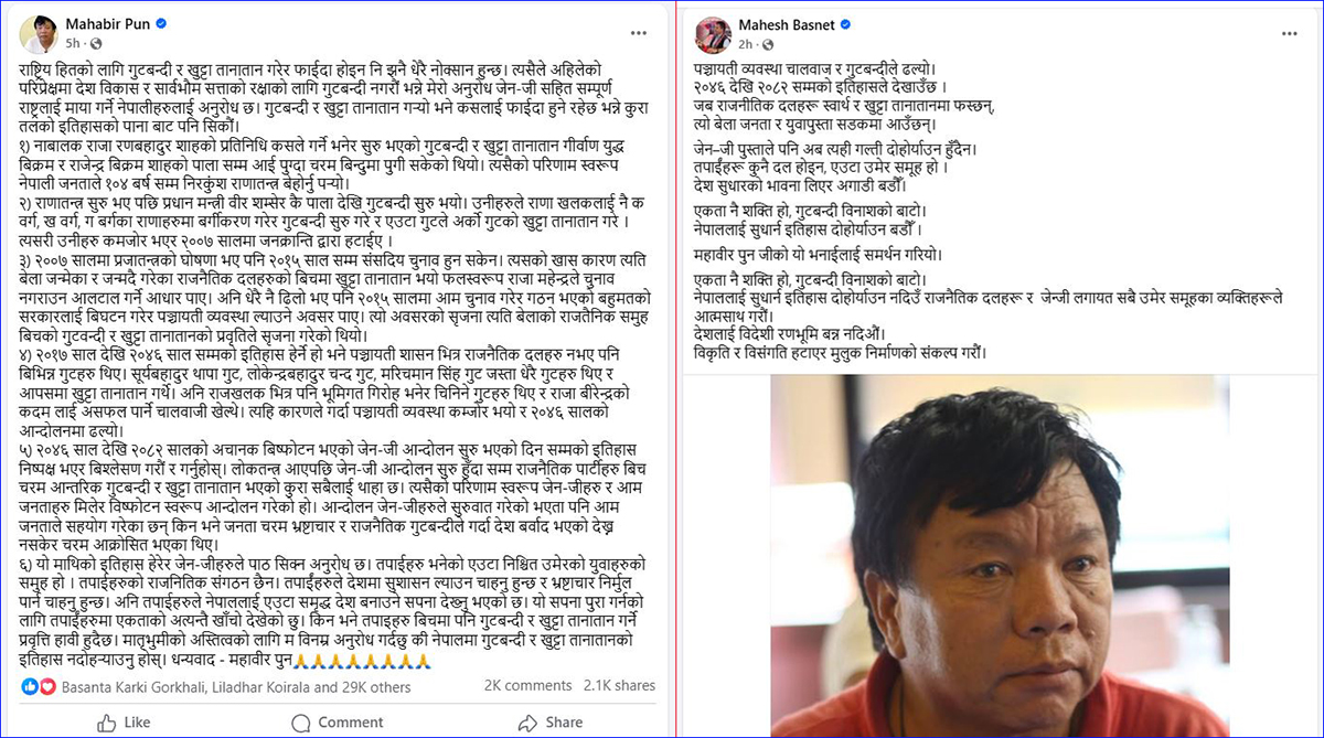 सामाजिक सञ्जालमा टिप्पणी गर्दै नेता बस्नेतले पुनले जेनजी युवाहरुलाई राष्ट्रिय हितको लागि गुटबन्दी र खुट्टा तानातान गर्दा झनै धेरै नोक्सान हुने बताउदै सम्पूर्ण राष्ट्रलाई माया गर्ने नेपालीहरुलाई गुटबन्दी नगर्न अनुरोध गरेकोप्रति समर्थन गरेका हुन् ।