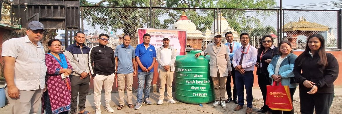 बैंकको कोटेश्वर शाखाद्वारा काठमाडौं महानगरपालिका –३२, कोटेश्वर समाज सुधार युवा क्लवलाई खानेपानीको ट्याङ्की हस्तान्तरण गरिएको छ । क्लव भवनमा खानेपानीको धारा जोडिएको तर पानी जम्मा गर्ने ट्याङ्कीको आवश्यकता भएको हुँदा बैंकले उक्त सहयोग गरेको हो । कोटेश्वर शाखाका प्रमुख उत्सव मकाजूले युवा क्लवका अध्यक्ष सुवास कुमार रिमाललाई उक्त ट्याङ्की हस्तान्तरण गरे ।