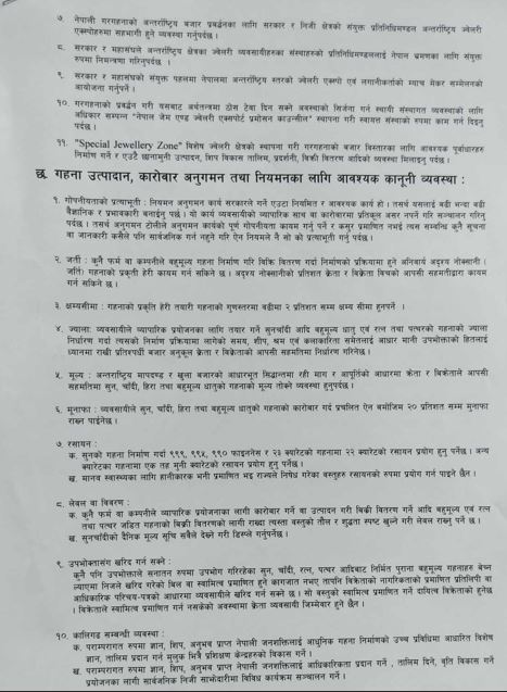 कायृक्रममा स्वदेशी रत्न पत्थरको उत्खनन, प्रशोधन र निर्यात आदिका लागि सरकारले निजी क्षेत्रसंग सहकार्य गरी आवश्यक पूर्वाधारहरु तयार गरी प्रवर्द्धनका लागि संस्थागत संरचना निर्माण गर्ने उल्लेख छ ।