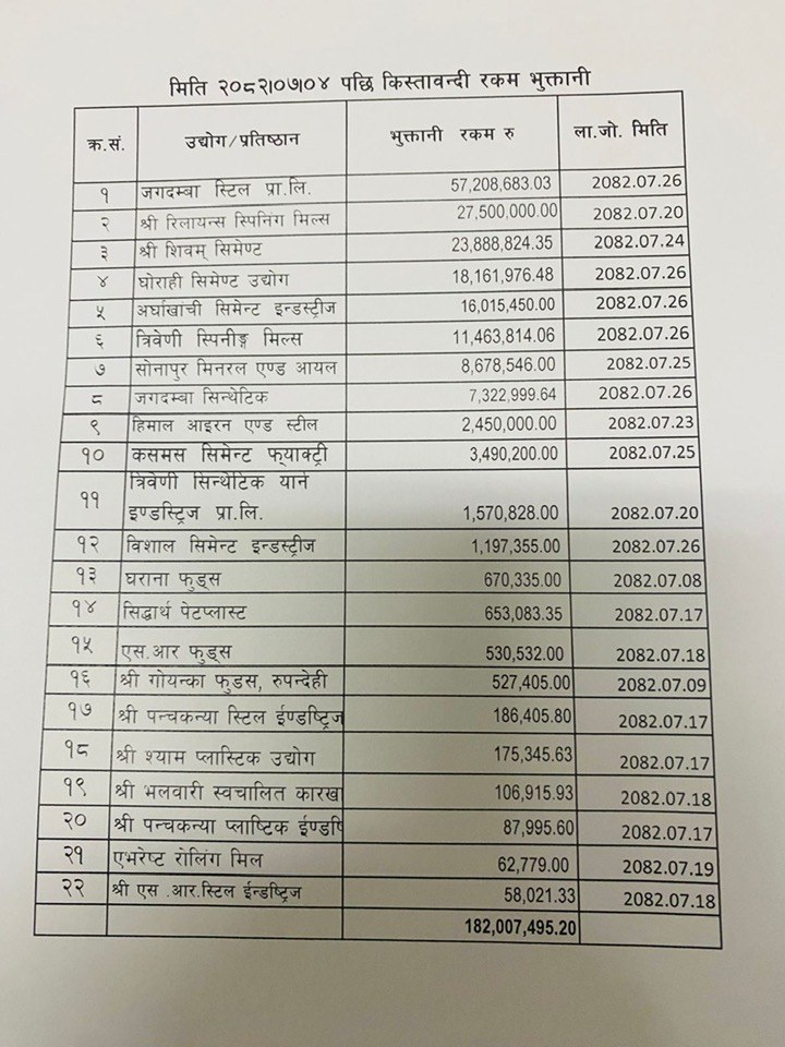 विद्युत महसुल बक्यौताबापत ३५ उद्योगले तिरे २३ करोड ८७ लाख, अझै ५ अर्ब ७० करोड बाँकी
