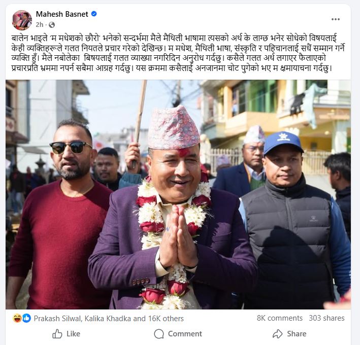 उनले भनेका छन्, ‘बालेन भाइले ‘म मधेशको छोरो’ भनेको सन्दर्भमा मैले मैथिली भाषामा त्यसको अर्थ के लाग्छ भनेर सोधेको विषयलाई केही व्यक्तिहरूले गलत नियतले प्रचार गरेको देखिन्छ । म मधेश, मैथिली भाषा, संस्कृति र पहिचानलाई सधैं सम्मान गर्ने व्यक्ति हुँ । मैले नबोलेका विषयलाई गलत व्याख्या नगरिदिन अनुरोध गर्दछु । कसैले गलत अर्थ लगाएर फैलाएको प्रचारप्रति भ्रममा नपर्न सबैमा आग्रह गर्दछु । यस क्रममा कसैलाई अन्जानमा चोट पुगेको भए म क्षमायाचना गर्दछु ।’