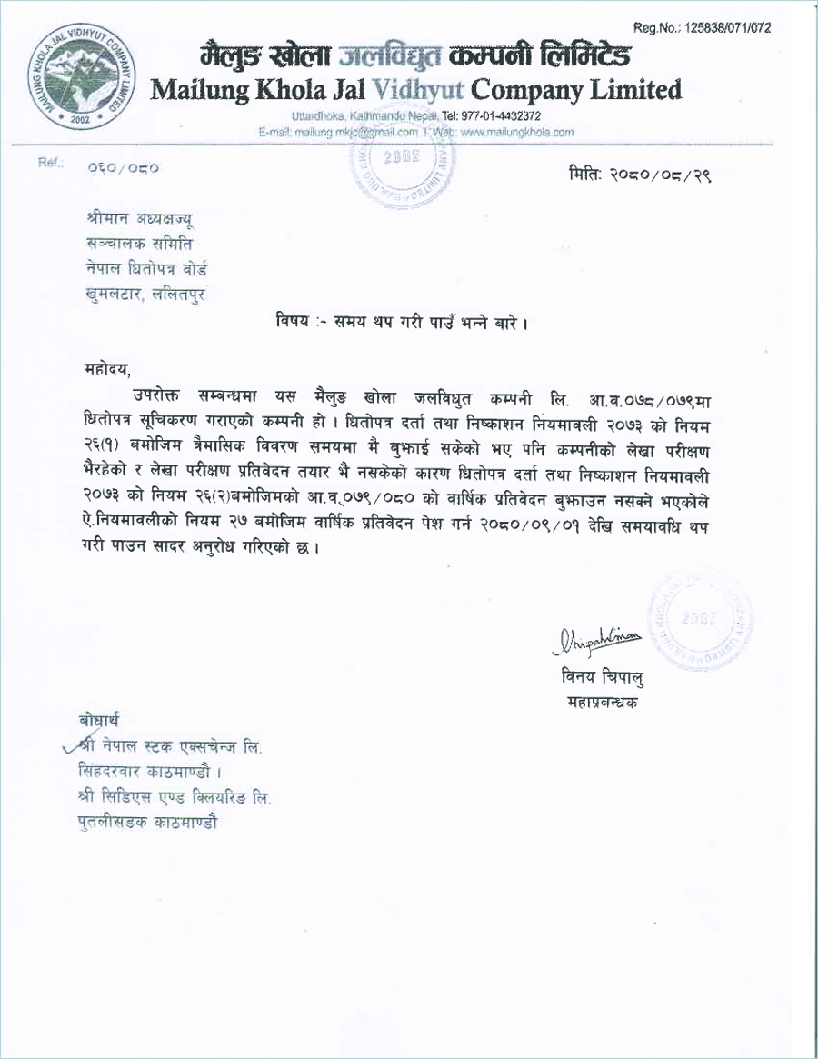 ‘मैलुङ खोला जलविधुत कम्पनी लि. आ.व. ०७८/०७९मा धितोपत्र सूचिकरण गराएको कम्पनी हो । धितोपत्र दर्ता तथा निष्काशन नियमावली २०७३ को नियम २६(१) बमोजिम त्रैमासिक विवरण समयमै बुझाइसकेको भए पनि कम्पनीको लेखा परीक्षण भइरहेको र लेखा परीक्षण प्रतिवेदन तयार भइनसकेको कारण धितोपत्र दर्ता तथा निष्काशन नियमावली २०७३ को नियम २६ (२) बमोजिमको आ.व. ०७९/०८० को वार्षिक प्रतिवेदन बुझाउन नसक्ने भएकाले ऐ. नियमावलीको नियम २७ बमोजिम वार्षिक प्रतिवेदन पेश गर्न २०८०/०९/०१ देखि समयावधि थप गरी पाउन सादर अनुरोध गरिएको छ,’ कम्पनीले धितोपत्र बोर्ड र सीडीएस एण्ड क्लियरिङ लिमिटेडलाई लेखेको पत्रमा भनिएको छ ।