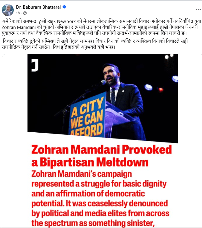 उनले लेखेका छन्, ‘अमेरिकाको सबभन्दा ठूलो शहर न्यूयोर्कको मेयरमा लोकतान्त्रिक समाजवादी विचार अंगीकार गर्ने नवनिर्वाचित युवा जोहरान ममदानीको चुनावी अभियान र त्यसले उठाएका वैचारिक–राजनीतिक मुद्दाहरूलाई हाम्रो नेपालका जेनजी युवाहरू र नयाँ तथा वैकल्पिक राजनीतिक शक्तिहरूले पनि उपयोगी सन्दर्भ–सामाग्रीको रूपमा लिन जरूरी छ।’