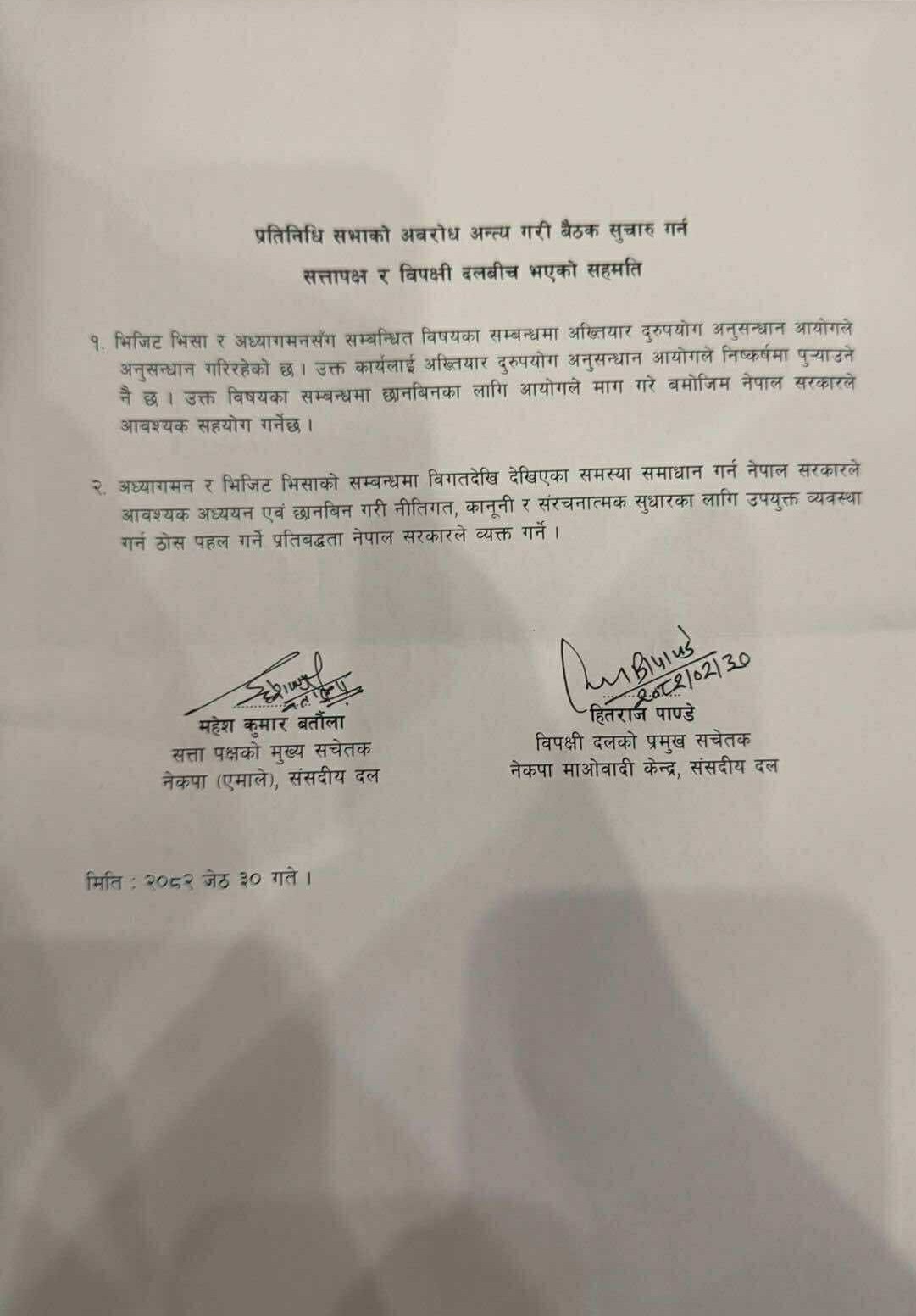 माओवादी उपमहासचिव वर्षमान पुनका अनुसार भिजिट भिसा प्रकरणको छानबिन र अध्ययन गर्न उपयुक्त संयन्त्र गठन गर्ने गरी दुईबुँदे सहमति भएको छ । यो सहमतिसँगै प्रतिनिधि सभामा जारी अवरोध हटाउने समझदारी भएको छ । सहमतिपत्रमा कांग्रेस प्रमुख सचेतक श्यामकुमार घिमिरे, एमाले मुख्य सचेतक महेश बर्तौला र माओवादीका प्रमुख सचेतक हितराज पाण्डेले हस्ताक्षर गरेका छन् ।