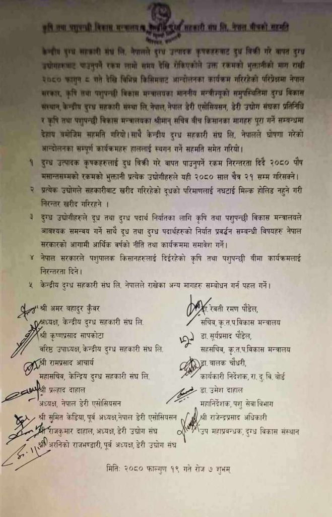 दुग्ध विकास संस्थान, केन्द्रीय दुग्ध सहकारी संस्थ, नेपाल, नेपाल डेरी एसोसिएसन, डेरी उद्योग संघका प्रतिनिधि र कृषि तथा पशुपन्छी विकास मन्त्रालयका सचिवबिच किसानका मागहरू पूरा गर्ने सम्बन्धमा सहमति गरिएको हो ।
