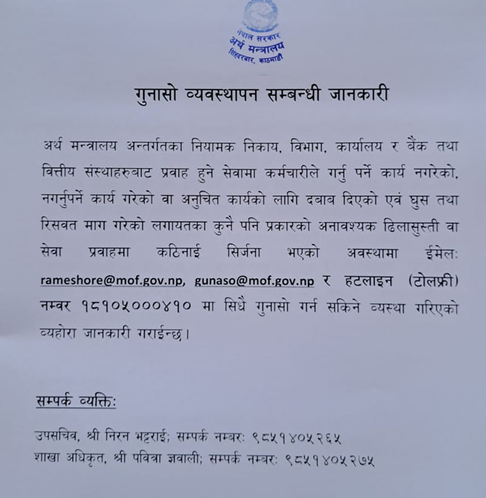 सम्पर्क गर्ने ईमेल ठेगाना rameshore@mof.gov.np र gunaso@mof.gov.np र हटलाइन (टोलफ्री) नम्वर १८१०५०००४१० मा सिधै गुनासो गर्न सकिने जानकारी दिइएको छ ।