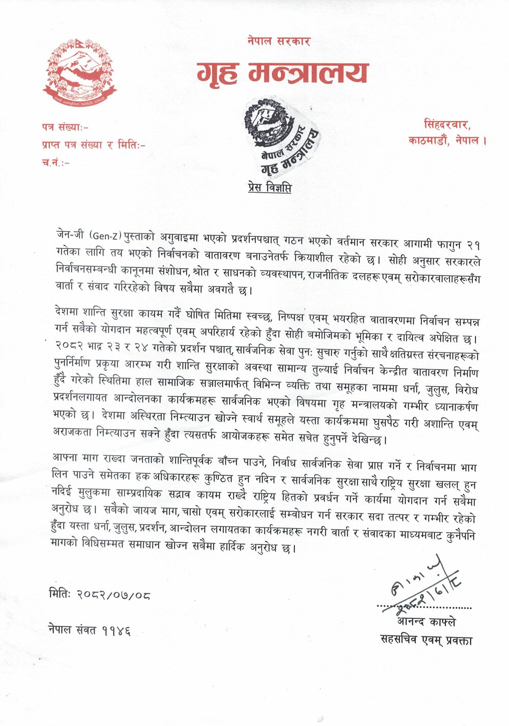 २०८२ भाद्र २३ र २४ गतेको प्रदर्शन पश्चात्, सार्वजनिक सेवा पुनः सुचारु गर्नुको साथै क्षतिग्रस्त संरचनाहरूको पुनर्निर्माण प्रकृया आरम्भ गरी शान्ति सुरक्षाको अवस्था सामान्य तुल्याई निर्वाचन केन्द्रीत वातावरण निर्माण हुँदै गरेको स्थितिमा हाल सामाजिक सञ्जालमार्फत् विभिन्न व्यक्ति तथा समूहका नाममा धर्ना, जुलुस, विरोध प्रदर्शनलगायत आन्दोलनका कार्यक्रमहरू सार्वजनिक भएको विषयमा गृह मन्त्रालयको गम्भीर ध्यानाकर्षण भएको छ। देशमा अस्थिरता निम्त्याउन खोज्ने स्वार्थ समूहले यस्ता कार्यक्रममा घुसपैठ गरी अशान्ति एवम् अराजकता निम्त्याउन सक्ने हुँदा त्यसतर्फ आयोजकहरू समेत सचेत हुनुपर्ने देखिन्छ ।