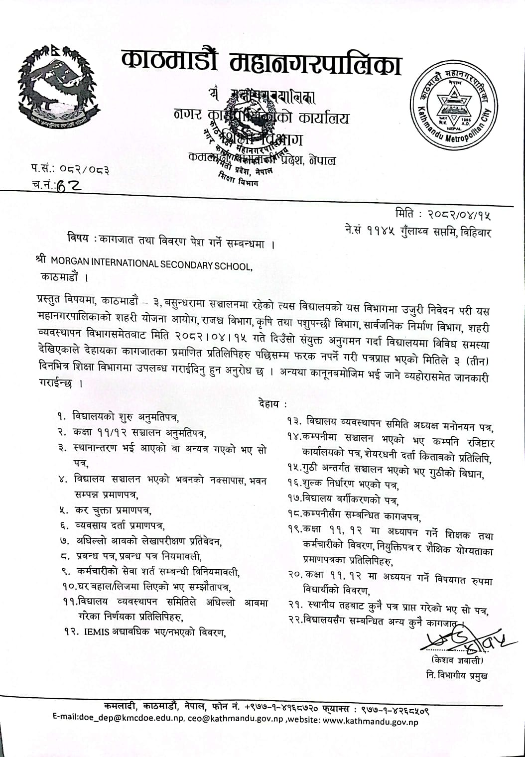 काठमाडौं । काठमाडौं महानगरपालिकाले वसुन्धरास्थित मोर्गन इन्टरनेसनल सेकेन्डरी स्कुललाई तीन दिनभित्र आवश्यक कागजपत्र बुझाउन निर्देशन दिएको छ ।