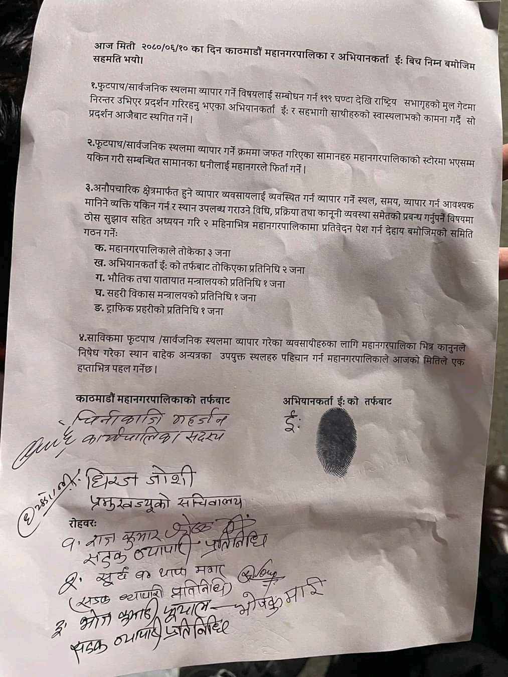 मंगलबार दुई पक्षबीच वार्ता भएर चार बुँदे सहमतिपत्र तयार भएको थियो । सहमतिको ४ नम्बर बुँदामा महानगर प्रमुख बालेन्द्र शाहले संशोधन गरेपछि त्यसलाई आन्दोलनरत पक्षले अस्वीकार गरेको थियो ।