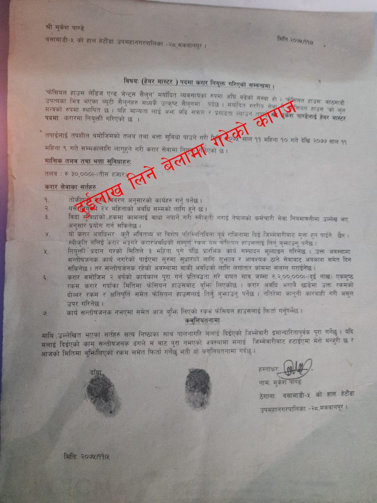महराका अनुसार मुकेशले काठमाडौं ब्रान्चमा पनि काममा नै नआई कहिले भाई मर्यो , कहिले जग्गाको मुद्धा छ भन्ने वाहानामा काममा नै नआउने गरेका थिए । तर पछील्लो केहि महिना लगातार आएर काम गर्न थाले । उनी भन्छिन् ’उसको नियत अर्कै रहिछ माघ १३ गतेमात्र थापायौ, फेसल हाउसमै काम गर्ने अन्य स्टाफहरुबाट ७ हजार उठाउदै ट्रेनिङ दिदै ट्रेनिङ सकिएपछी ४० ,५० हजारको जागीर लगाई दिन्छु भनेर लगिरहेको रहेछ’ ।