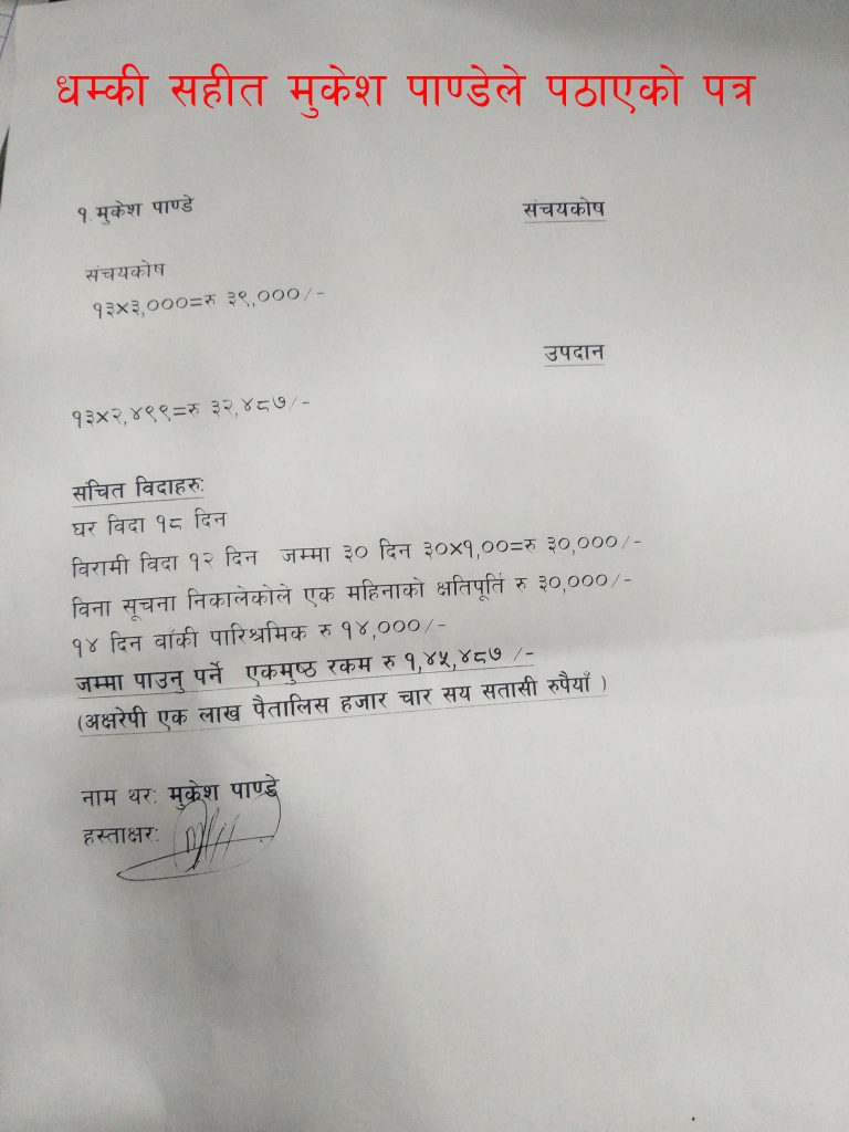 महराले थप्दै भनिन ’यस पछि हामीले तुरुन्तै स्पस्टीकरण लिएर एडभान्स बापतको रकम फिर्ता गर्न र हरहिसाब फरफारक गर भनेर सुचना नै जारी गर्यौ, तर उल्टै मिडिया वाजिगर्ने कार्यगरी रहेको छ’ । ‘जुन प्रयोजनका लागि रकम लिएको हो सो प्रयोजनका लागि काम गर्न नसकेपछि मुकेश पाण्डेले कागज गरेर लगेको पैसा फिर्ता गर्नुपर्छ कि पर्दैन ? तपाईं नै भन्नुस्’ महराले आफ्नो कुरा राख्दै भनिन । अब आफु कानुनी उपचारमा जाने पनि उनले बताईन् ।