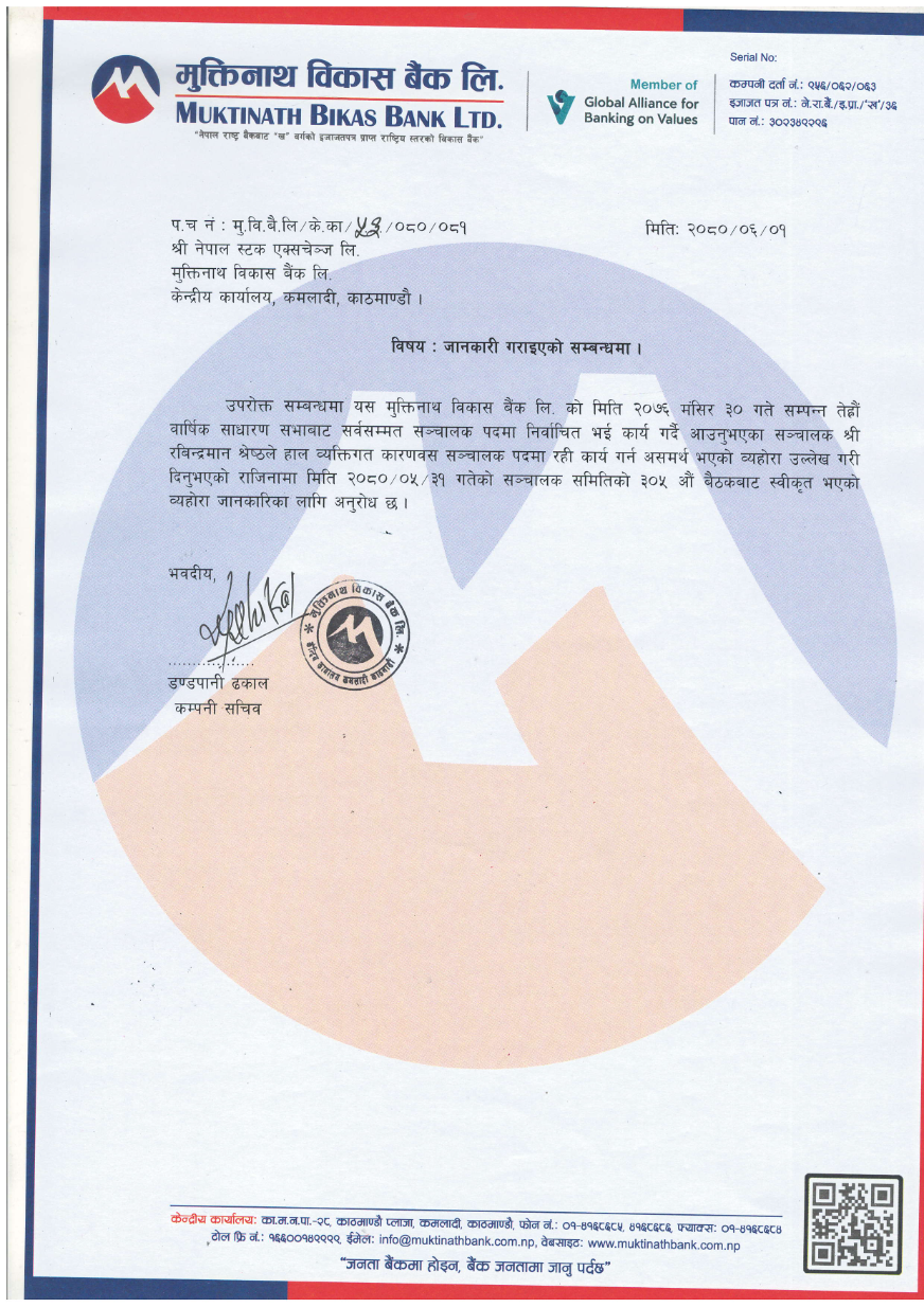 काठमाडौं । मुक्तिनाथ विकास बैंक लिमिटेडका सञ्चालक रबिन्द्रमान श्रेष्ठको राजिनामा स्वीकृत भएको छ ।