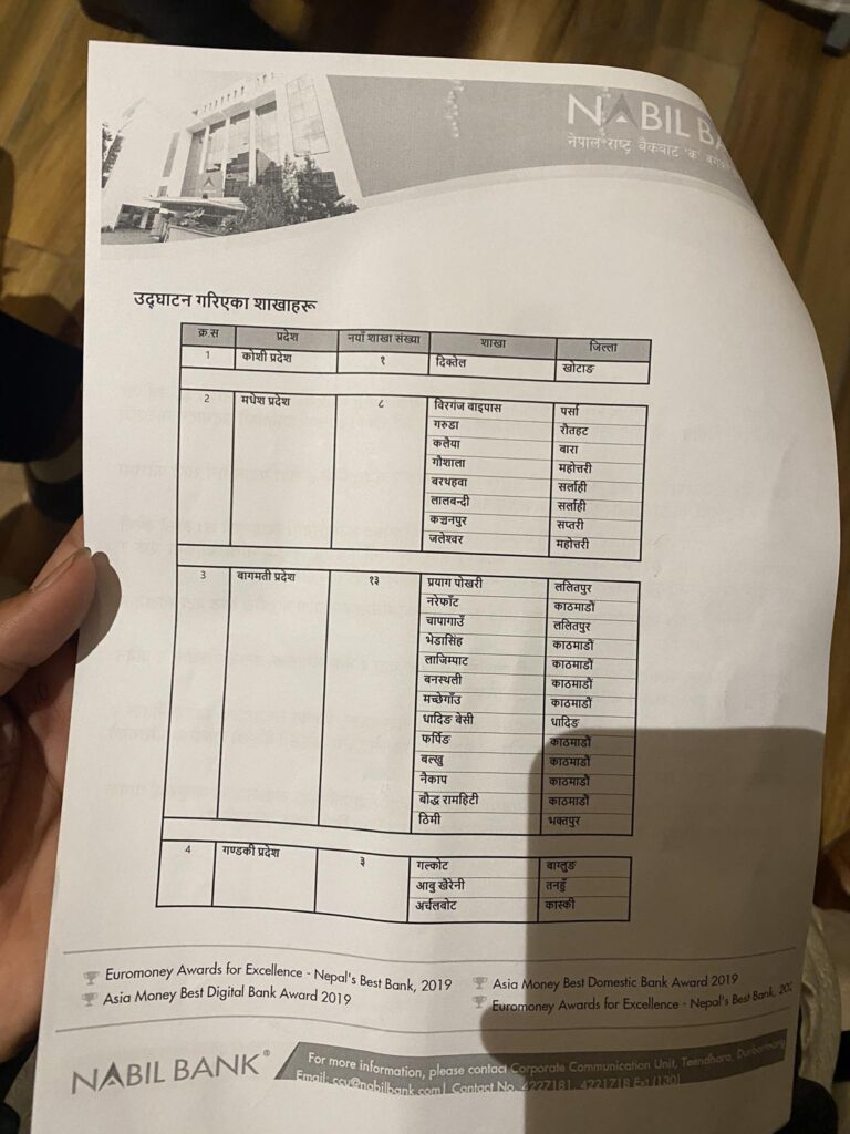नबिल बैंकका अध्यक्ष उपेन्द्रप्रसाद पौड्यालले ८ वटा र बैंकका संचालक निर्वाण चौधरीले ८ वटा शाखाहरु उद्घाटन गरेका छन् । त्यस्तै, बैंकका संचालक आशा राणा अधिकारीले थप ८ वटा र बैंक संचालक अनन्त पौड्याल र प्रविन टिबडेवालाले थप ७(७ वटा शाखाको उद्घाटन गरे ।