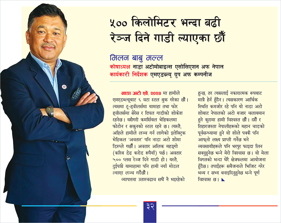 नाडा अटो शो, २०२४ मा हामीले एमएडब्ल्यूबाट ६ वटा स्टल बुक गरेका छौँ । त्यसमा टू–ह्वीलर्समा यामाहा तथा फोर ह्वीलर्समा सेरेस र दिपल गाडीको शोकेश रहनेछ ।