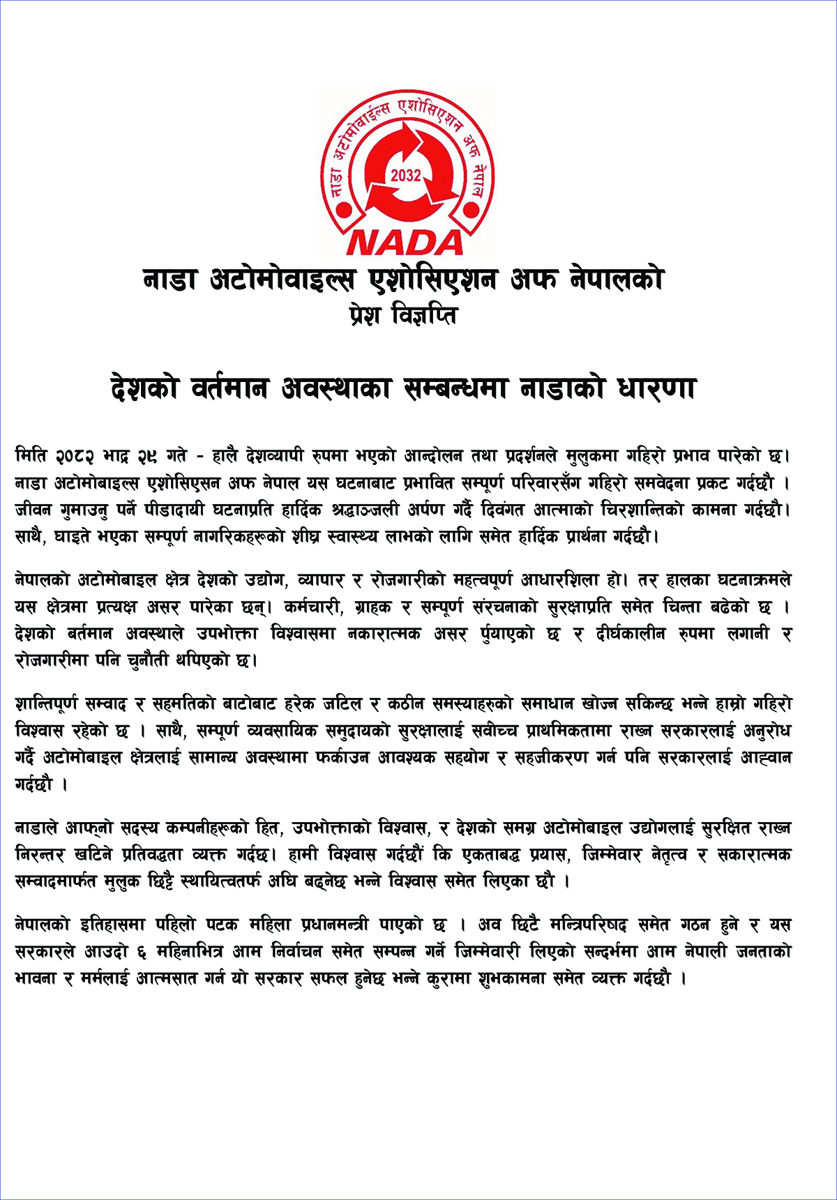 आज आइतबार विज्ञप्ति जारी नाडाले भदौ २३ र २४ गतेको आन्दोलनले देशको उद्योग, व्यापार र रोजगारीको महत्वपूर्ण आधारशिला बोकेको अटोमोबाइलका साथै देशमै गहिरो प्रभाव परेको भन्दै सो क्षेत्रलाई पूर्ववत: अवस्थामा फर्काउन सरकारको सहयोग खोजेको हो ।