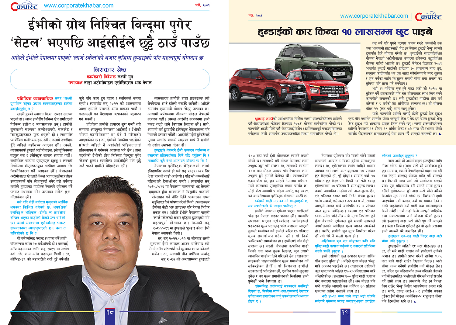 त्यसकारण हामीले हाम्रा प्रडक्टहरू त्यो सेगमेन्टमा अझै दरिलो बनाउँदै जानेछौँ । अहिले हामीसँग एउटामात्रै मोडल ‘भेन्यु’ उत्पादन छ । आगामी वर्षसम्ममा तीनवटा मोडल नेपालमै उत्पादन गर्छौँ । त्यसले आईसीई उत्पादनमा हाम्रो पकड बढ्दै जाने विश्वास लिएका छौँ । साथै, आगामी वर्ष हुण्डाईकै इलेक्ट्रिक भेहिकलहरू पनि नेपालमै उत्पादन गर्दैछौँ । आईसीई र ईभी दुईवटैलाई एसाथ अगाडि बढाउने लक्ष्यका साथै नै हामीले यो उद्योग स्थापना गरेका हौँ ।