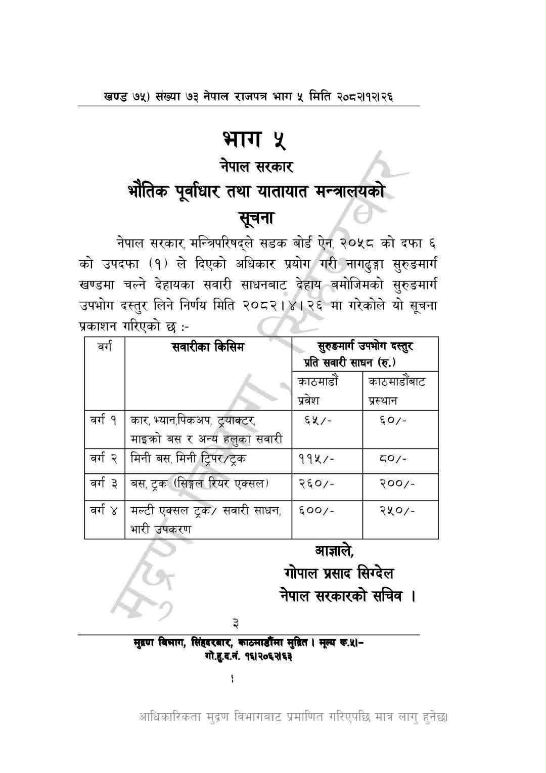 भौतिक पूर्वाधार तथा यातायात मन्त्रालयले आज नेपाल राजपत्रमा सूचना प्रकाशन गर्दै सवारी साधनको वर्गीकरण अनुसारको शुल्क तोकेको हो ।
