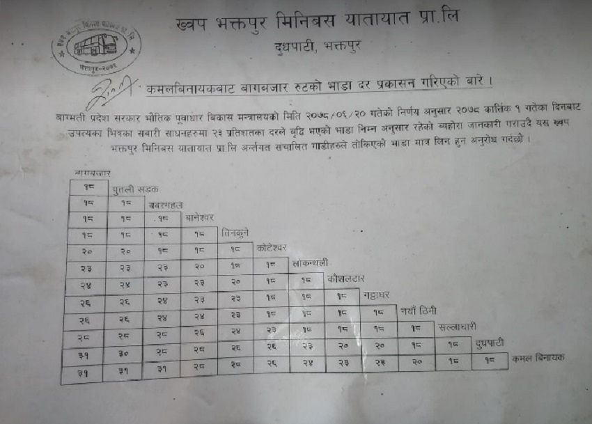 उपत्यकाभित्र सार्वजनिक सवारी साधनमा शून्य किलोमिटरदेखि पाँच किलोमिटरसम्म १८ रुपैयाँ, १० किलोमिटरसम्म २३ रुपैयाँ, १५ किलोमिटरसम्म २७ रुपैयाँ, २० किलोमिटसम्म ३० रुपैयाँ र २० किलोमिटर भन्दामाथि ३५ रुपैयाँ भाडादर तोकेको छ ।