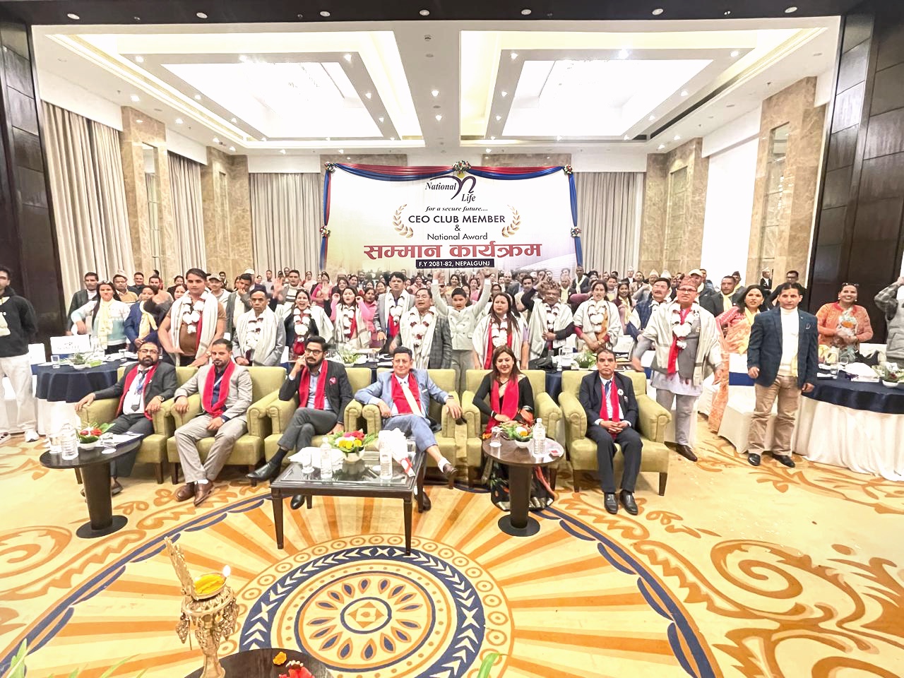 आर्थिक वर्ष २०८१/८२ मा तोकिएको बीमाशुल्क संकलन गरी कर्णाली प्रदेशबाट योग्य हुनु भएका ११५ जना अभिकर्ताहरु र सुदुरपश्चिम प्रदेशबाट योग्य हुनु भएका १६१ जना अभिकर्ताहरु, विभागिय प्रमुखहरु, प्रदेश प्रमुख एवं लुम्बिनी प्रदेश अन्तर्गत रहेका शाखा कार्यालयका शाखा प्रमुखहरुको सहभागितामा कम्पनीले सिईओ क्लब सदस्य बन्न सफल अभिकर्ताहरुलाई सम्मान गरेको हो ।