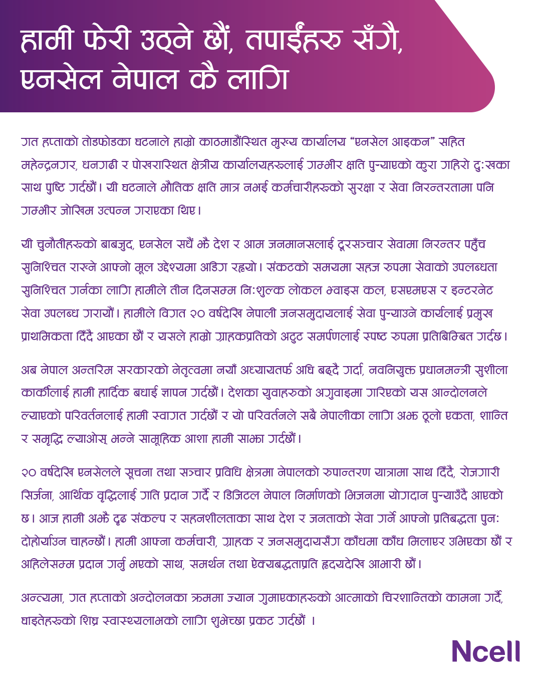 २० वर्षदेखि एनसेलले सूचना तथा सञ्चार प्रविधि क्षेत्रमा नेपालको रुपान्तरण यात्रामा साथ दिँदै, रोजगारी सिर्जना, आर्थिक वृद्धिलाई गति प्रदान गर्दै र डिजिटल नेपाल निर्माणको दूरदृष्टिमा योगदान पुर्याउँदै आएको जनाएको छ । विज्ञप्तिमा भनिएको छ, ‘आज हामी अझै दृढ संकल्प र सहनशीलताका साथ देश र जनताको सेवा गर्ने आफ्नो प्रतिबद्धता पुन: दोहोर्याउन चाहान्छौँ । हामी आफ्ना कर्मचारी, ग्राहक र जनसमुदायसँग काँधमा काँध मिलाएर उभिएका छौं र अहिलेसम्म प्रदान गर्नुभएको साथ, समर्थन तथा ऐक्यबद्धताप्रति हृदयदेखि आभारी छौँ ।’