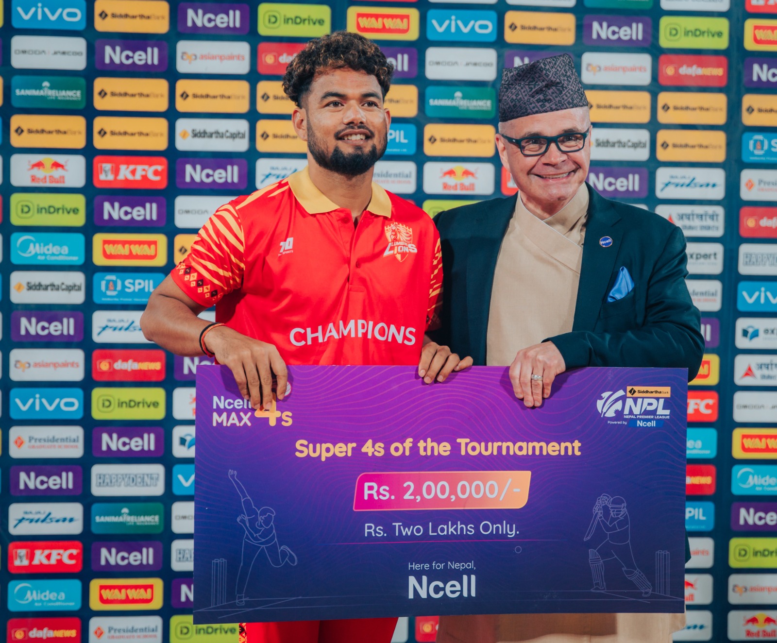 यस वर्ष पनि एनसेल एनपीएलको ‘पावर्ड बाइ’ साझेदार रहेको थियो । कम्पनीले दोस्रो संस्करणका प्रत्येक खेलमा सबैभन्दा बढी चौका प्रहार गर्ने खेलाडीलाई रु. २५,००० नगद पुरस्कार प्रदान गरेको थियो । साथै, पोखरा एभेन्जर्सका एडम रोसिङ्टनले दोस्रो संस्करणमा सबैभन्दा धेरै चौका प्रहार गरेकाले एनसेलबाट रु. २,००,००० नगद पुरस्कार प्राप्त गरेका थिए ।