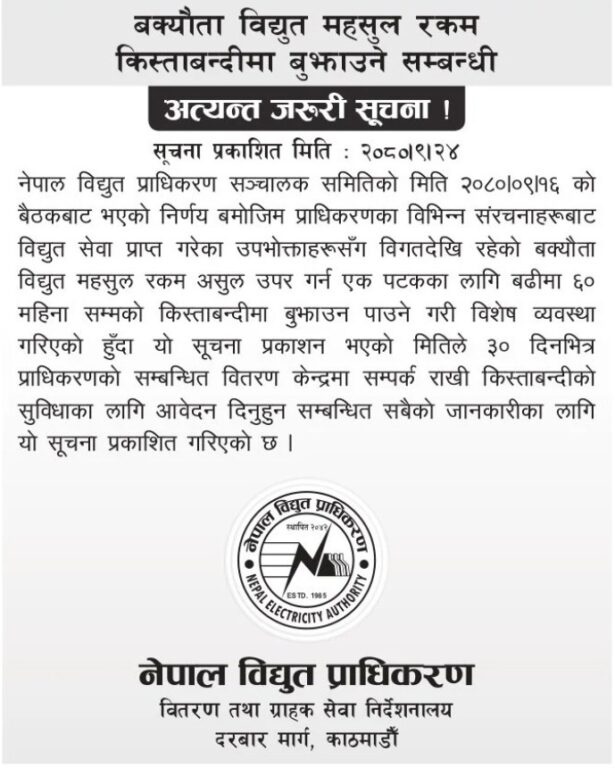 पुस १६ गते बसेको प्राधिकरण सञ्चालक समितिको बैठकले विभिन्न संरचनाहरूबाट विद्युत सेवा प्राप्त गरेका उपभोक्ताहरूसँग विगतदेखि रहेको बक्यौता विद्युत महसुल रकम असुल उपर गर्न एक पटकका लागि बढीमा ६० महिना सम्मको किस्ताबन्दीमा बुझाउन पाउने गरी विशेष व्यवस्था गरिएको सूचनामा उल्लेख गरिएको छ ।