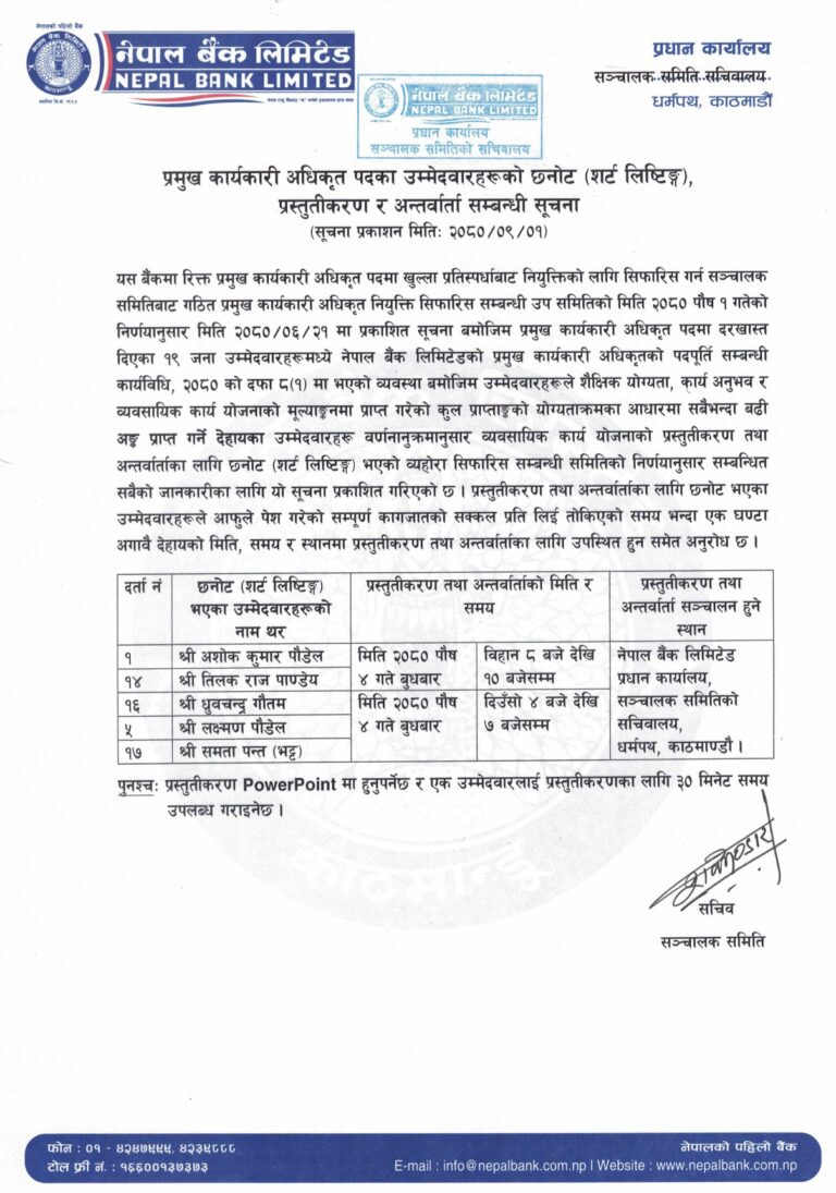 पौडेल र पाण्डेयको अन्तर्वार्ता पुस ४ गते बिहान ८ देखि १० बजेसम्म हुनेछ । गौतम, पौडेल र भट्टको भने बुधबार दिउँसो ४ देखि ७ बजेसम्म हुनेछ । बैंकले असोज २१ गते सीईओका लागि आवेदन माग गरेको छ ।