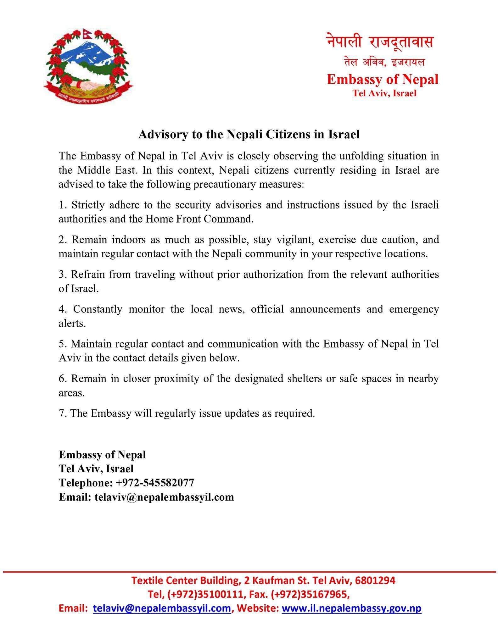 ‘इजरायल र इरानद्वारा जारी गरिएका सुरक्षा परामर्श तथा निर्देशनहरू कडाइका साथ पालना गर्नुहोस्,’ परराष्ट्र मन्त्रालयले भनेको छ, ‘सकेसम्म घरभित्रै बस्नुहोस्, सतर्क रहनुहोस्, आवश्यक सावधानी अपनाउनुहोस्, र आफू रहेको स्थानको नेपाली समुदायसँग नियमित सम्पर्कमा रहनुहोस् ।’मन्त्रालयले इजरायल र इरानका सम्बन्धित निकायहरूको पूर्वअनुमतिबिना यात्रा नगर्न पनि भनेको छ ।
