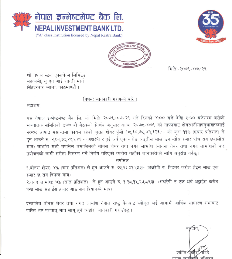 प्रस्तावित लाभांश नेपाल राष्ट्र बैंकको स्वीकृतिपछि बैंकको आगामी वार्षिक साधारणसभाबाट अनुमोदन गरी सेयरधनीहरुलाई वितरण हुनेछ ।