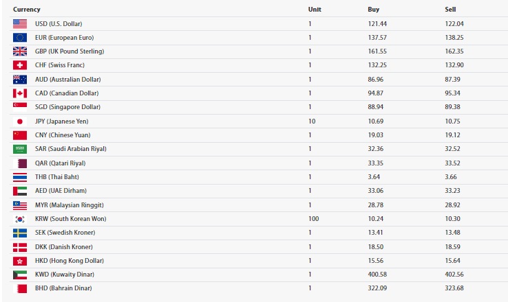 काठमाडौँ । नेपाल राष्ट्र बैंकले आइबारको लागि विदेशी मुद्राको विनिमय दर सार्वजनिक गरेको छ । राष्ट्र बैंकले अमेरिकी डलर एकको खरिद दर अधिकतम १२१ रुपैयाँ ४४ पैसा र बिक्री दर १२२ रुपैयाँ ४ पैसा कायम गरेको छ ।