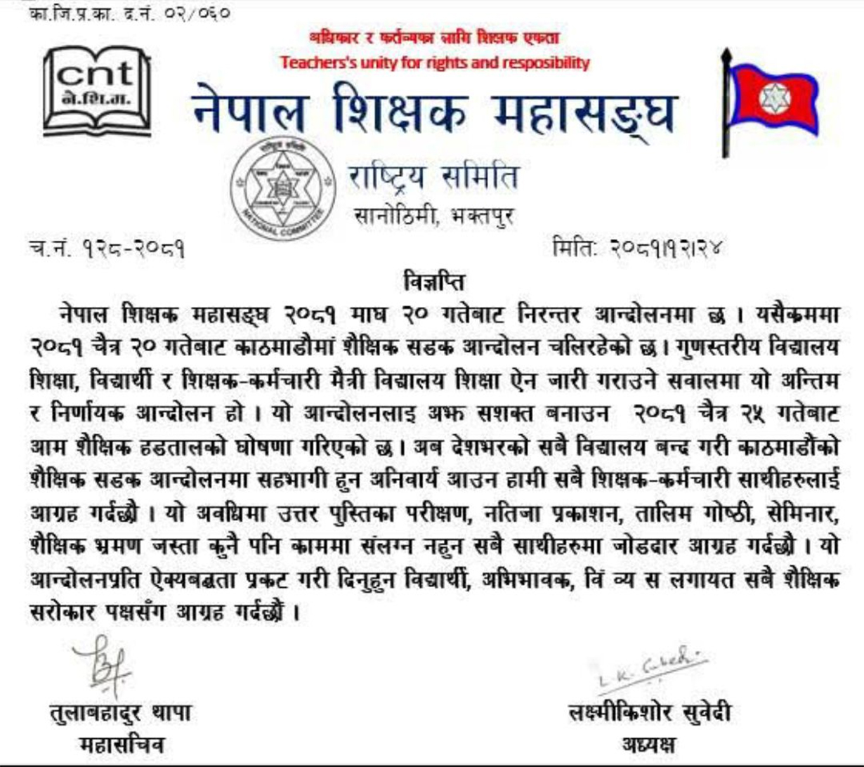 नेपाल शिक्षक महासंघको नेतृत्वमा चैत २५ गतेदेखि शैक्षिक हड्ताल घोषणा गरेकोे हो ।