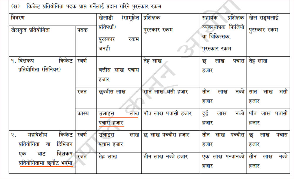 त्यस्तै प्रशिक्षकलाई ६ लाख २५ हजार, सहायक प्रशिक्षक, व्यवस्थापक, फिजियो वा चिकित्सकलाई ३ लाख २५ हजार र खेल संघलाई ६ लाख ५० हजार पुरस्कार दिने व्यवस्था गरिएको छ ।