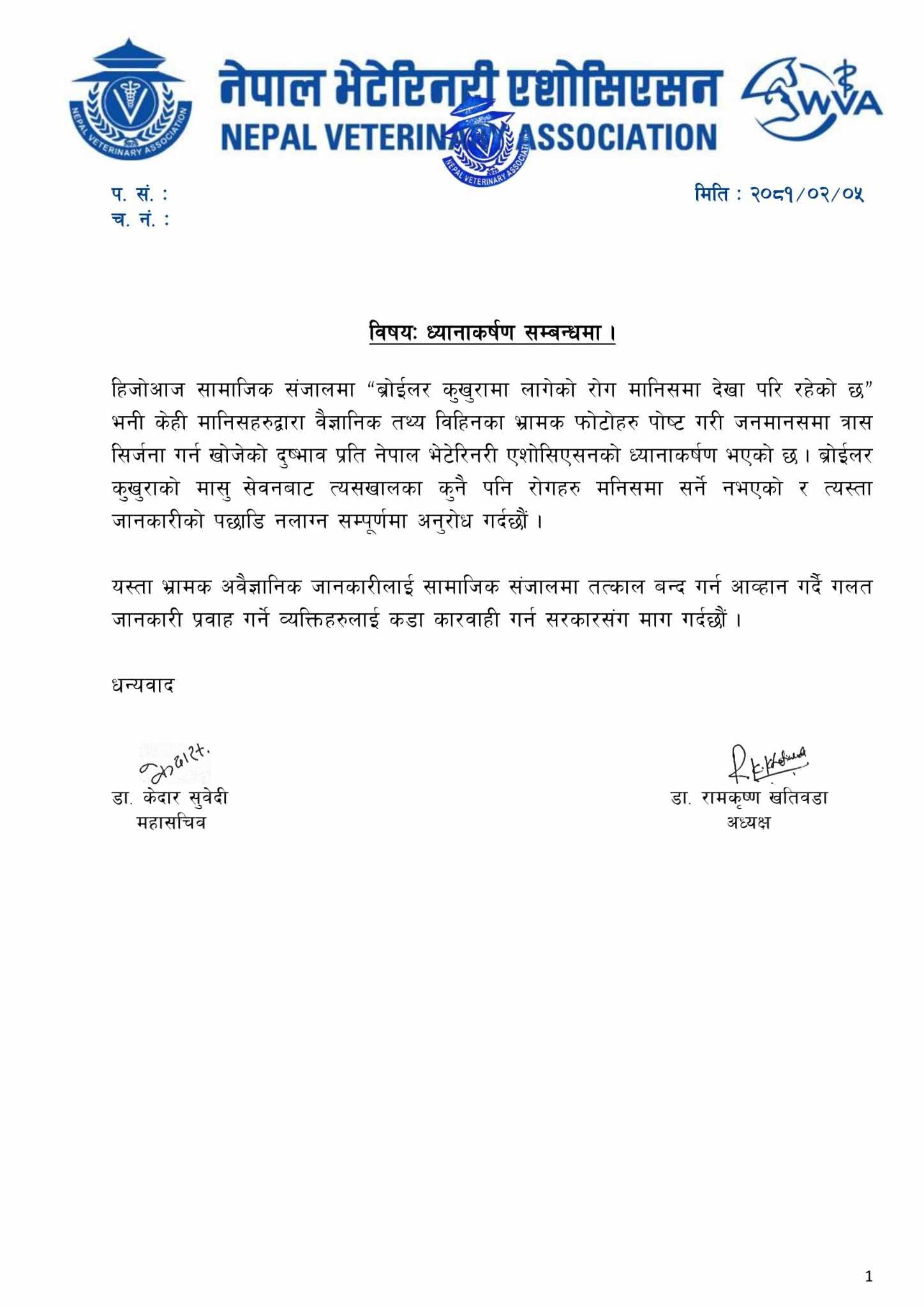 एसोसिएशनका अध्यक्ष डा. रामकृष्ण खतिवडा र महासचिव डा. केदार सुवेदीले आज विज्ञप्ति जारी गर्दै यसबारे बजारमा फैल्याइएको हल्लामा सत्यता नरहेको स्पष्ट पारेका हुन् । ‘ब्रोइलर कुखुरामा लागेको रोग मानिसमा पनि देखापरेको छ’ भन्ने भनाइमा कुनै सत्यता नरहेको विज्ञप्तिमा स्पष्ट पारिएको छ ।