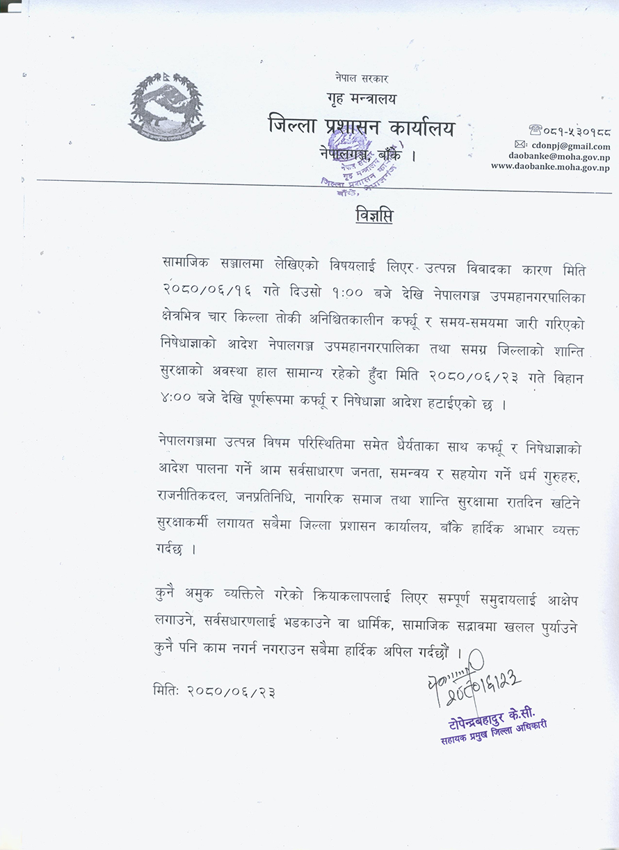 जिल्ला प्रशासन कार्यालय बाँकेले विज्ञप्ति जारी गर्दै असोज १६ गते दिउँसो १ बजेदेखि लगाइएको कर्फ्यु र निषेधाज्ञा आजदेखि पूर्ण रुपमा हटाएको जानकारी दिएको हो ।