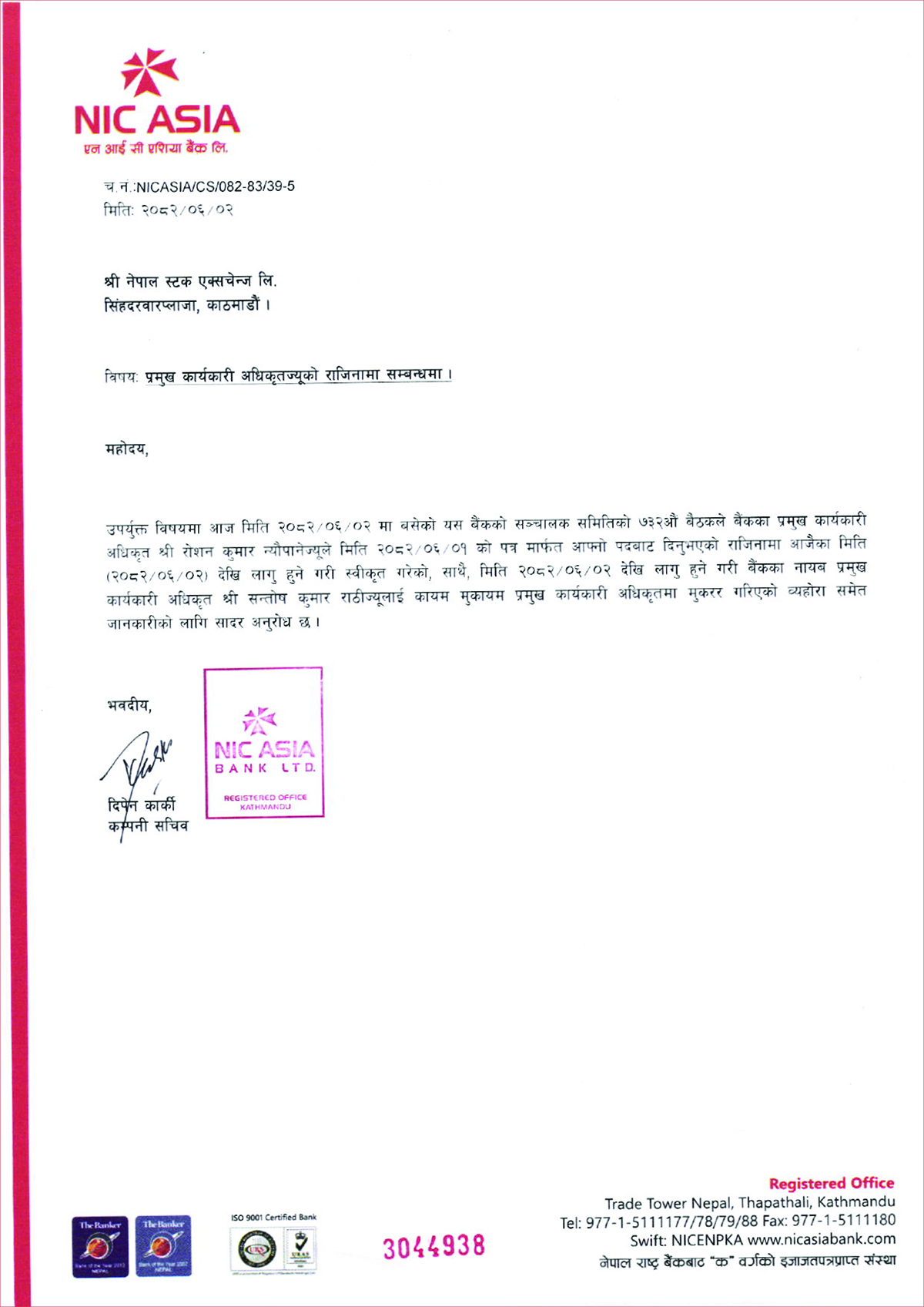 काठमाडौं । एनआईसी एसिया बैंकका प्रमुख कार्यकारी अधिकृत (सीईओ) रोशन न्यौपानेले राजीनामा दिएका छन् ।