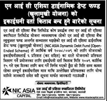 काठमाडौं। एनआइसी एशिया बैंकले एसिया डाइनामिक डेब्ट फन्डले लाभांश घोषणा गरेको छ ।