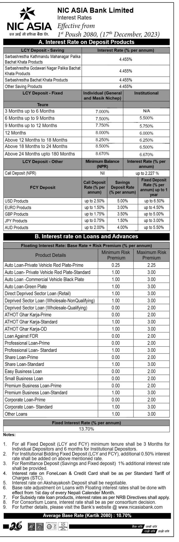 बैंकको पछिल्लो आधारदर १०.७० प्रतिशत रहेको छ । बैकबाट कर्जा लिँदा आधारदरमा अधिकतम ३ प्रतिशत प्रिमिमय थपेर १३.७० प्रतिशतमा कर्जा दिने जनाएको छ ।