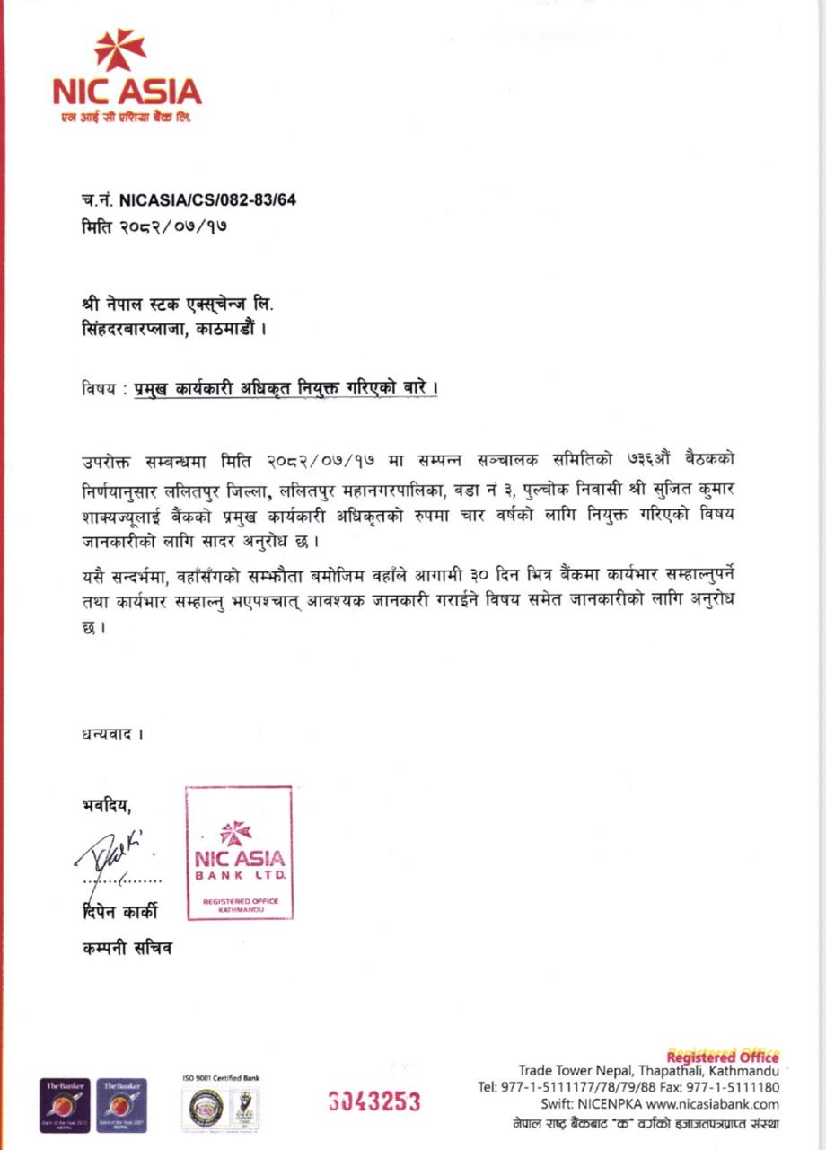 काठमाडौं । एनआईसी एसिया बैंकको प्रमुख कार्यकारी अधिकृत (सीईओ) मा सुजित कुमार शाक्य नियुक्त भएका छन् ।