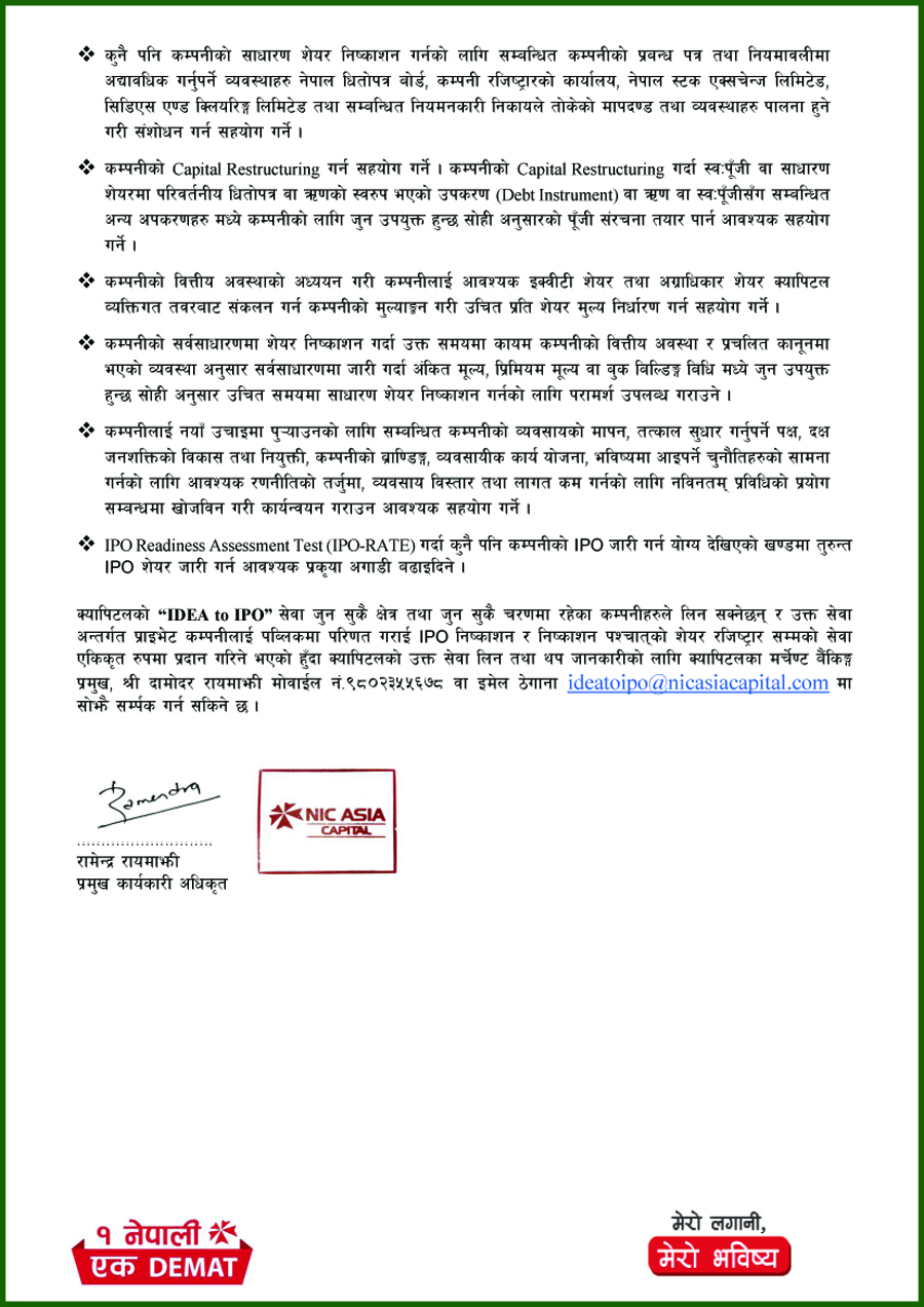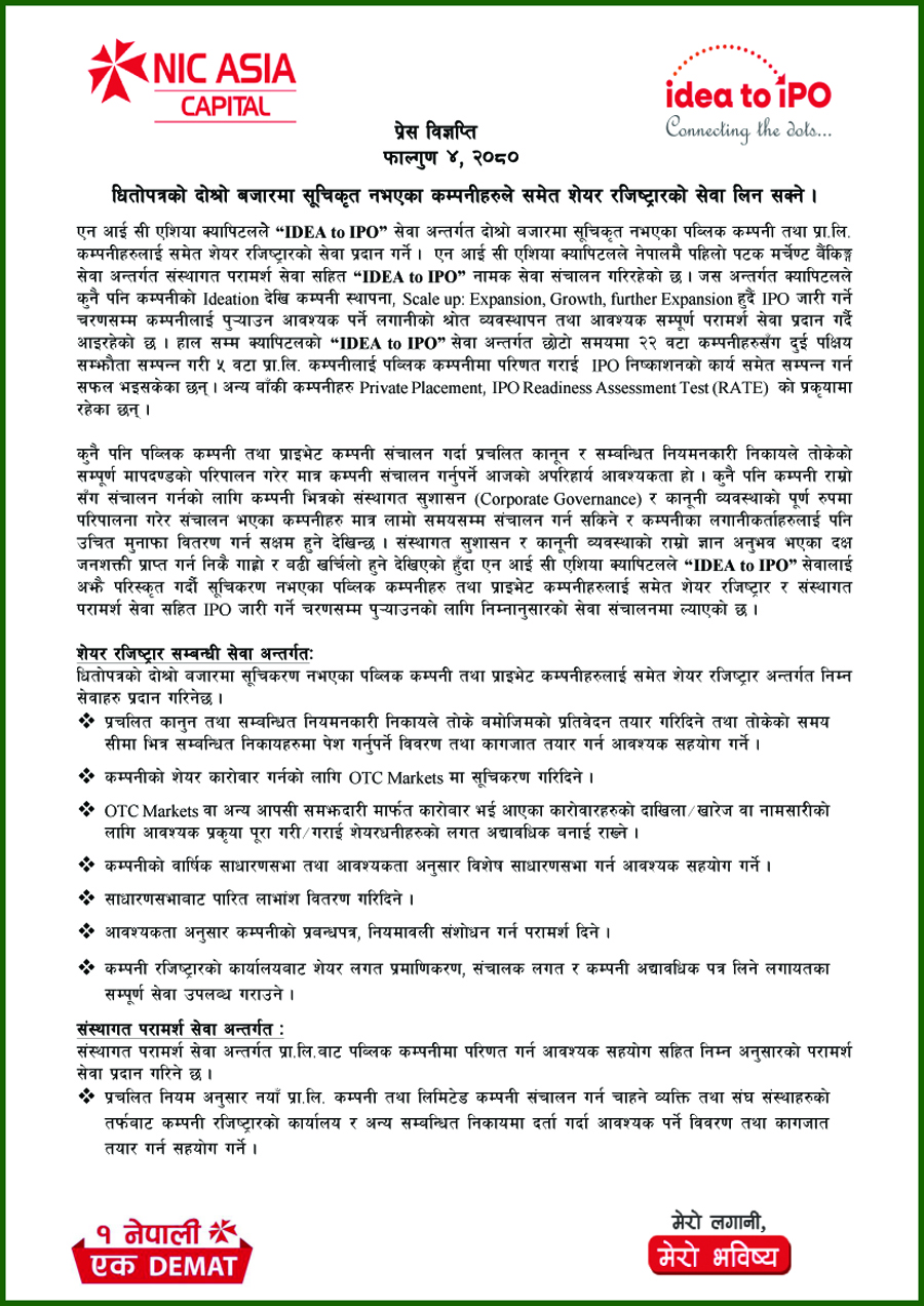क्यापिटलले ‘आइडिआ टू आईपीओ’ सेवाअन्तर्गत यस्तो सुविधा दिन लागेको हो । नेपालमै पहिलो पटक मर्चेण्ट बैंकिङ्ग सेवा अन्तर्गत संस्थागत परामर्श सेवासहित ‘आइडिआ टू आईपीओ’ सेवा सञ्चालन गरिएको एनआईसी एशिया क्यापिटलले जनाएको छ ।
