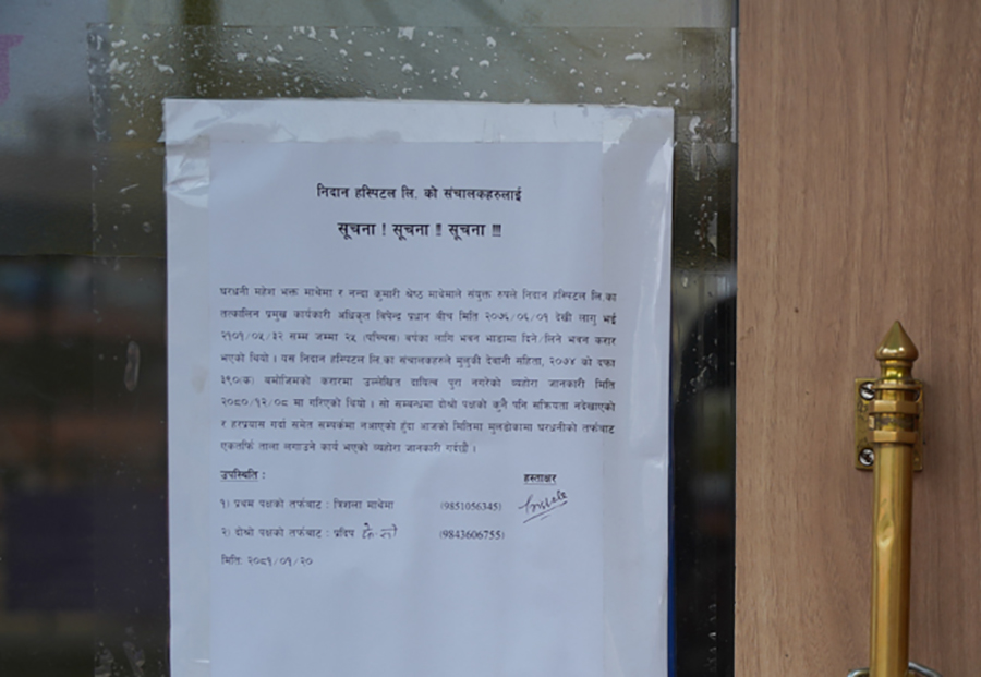 काठमाडौं । ललितपुरको पुल्चोकस्थित निदान हस्पिटलमा घरधनीले ताल्चा लगाएका छन् ।
