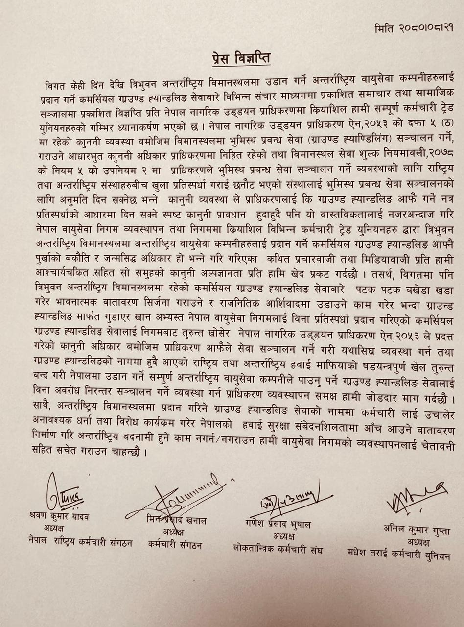 ट्रेड युनियनले संयुक्त विज्ञप्ति जारी गर्दै ग्राउन्ड ह्यान्डलिङ प्रतिस्पर्धाबाट निजी क्षेत्रलाई दिन सकिने बताएका छन्। प्राधिकरण ऐन २०५३ को दफा ५ ठ मा रहेको कानुनी व्यवस्था बमोजिम विमानस्थलमा भूमिस्थ प्रवन्ध सेवा गराउने अधिकार प्राधिकरणमा रहेको बताएका छन्।