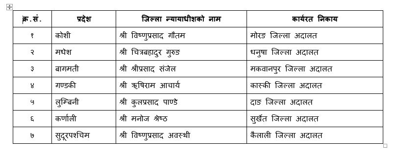 उनीहरूको स्थानमा मंसिर २८ मा कानून, न्याय तथा संसदीय मामिला मन्त्रालयको पत्र अनुसार जगेडा सूचीमा रहेका देहाय बमोजिमका जिल्ला न्यायाधीशहरूलाई राष्ट्रिय सभा सदस्य निर्वाचन ऐन, २०७५ को दफा ७ बमोजिम आजैदेखि लागू हुने गरी निर्वाचन अधिकृतको पदमा नियुक्त गरिएको आयोगले जनाएको छ।