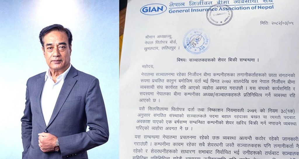 काठमाडौं । नेपाल निर्जीवन बीमा व्यवसायी संघले बीमा व्यबस्थामा रहेका समस्याहरुको समाधान गर्न नेपाल बीमा प्राधिकरणलाई अनुरोध गरेको छ ।नेपाल पुनर्बीमा कम्पनीहरुलाई दिई आएको प्रत्यक्ष हिस्सा, स्थानीय पनर्बीमा कम्पनीका सम्वन्धमा भएको व्यवस्था, जगेडा कोष तथा नेपाल पुनर्बीमा कम्पनीमा प्रतिनिधित्वका सम्वन्धमा हाल उल्लेखित प्रावधानहरुबारे संघले प्राधिकरणको ध्यानाकर्षण गराएको छ ।नेपाली पुनर्बीमा कम्पनीहरुलाई दिई आएको प्रत्यक्ष हिस्स … Continue reading निर्जीवन बीमा व्यबस्थामा रहेका समस्याको समाधान गर्न प्राधिकरणलाई संघको आग्रह